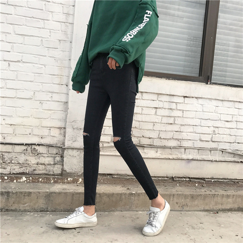 / 夏季新款女裝高腰修身顯瘦緊身彈力破洞毛邊學生小腳九分牛仔褲女