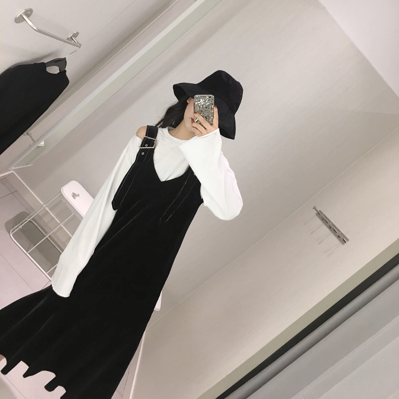 / 2018冬季新款復古韓版chic絲絨百搭不規則扣長款魚擺背帶連衣裙女