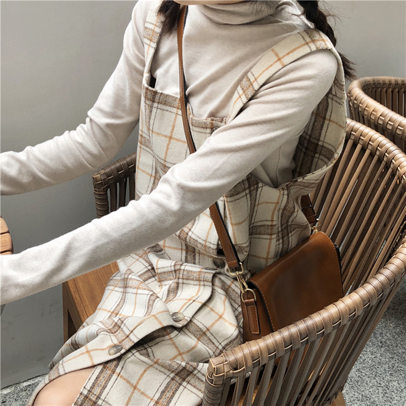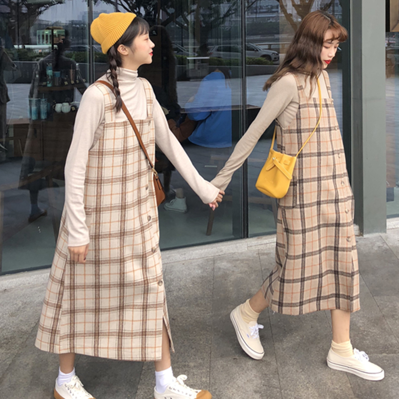 / 學院風套裝女秋2018新款開叉格子背帶連衣裙子修身長袖針織打底衫