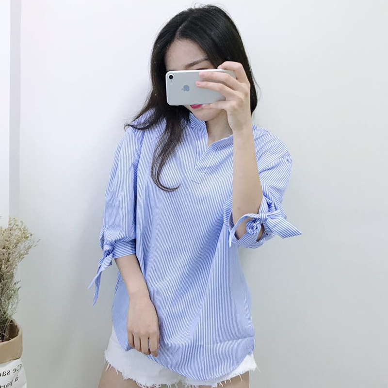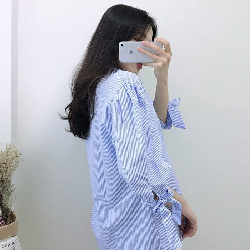 / 時尚條紋學院風系帶長袖襯衫秋冬新款冷系女裝薄外套V領寬松上衣