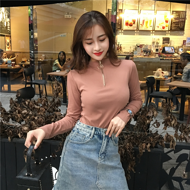 秋裝長袖t恤女2018新款韓版高領拉鏈心機上衣復古時尚百搭打底衫