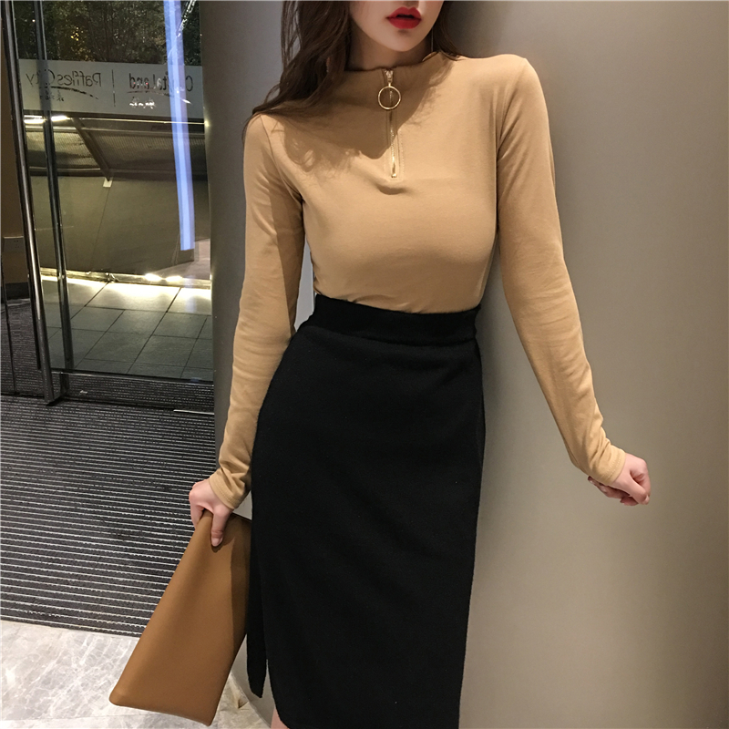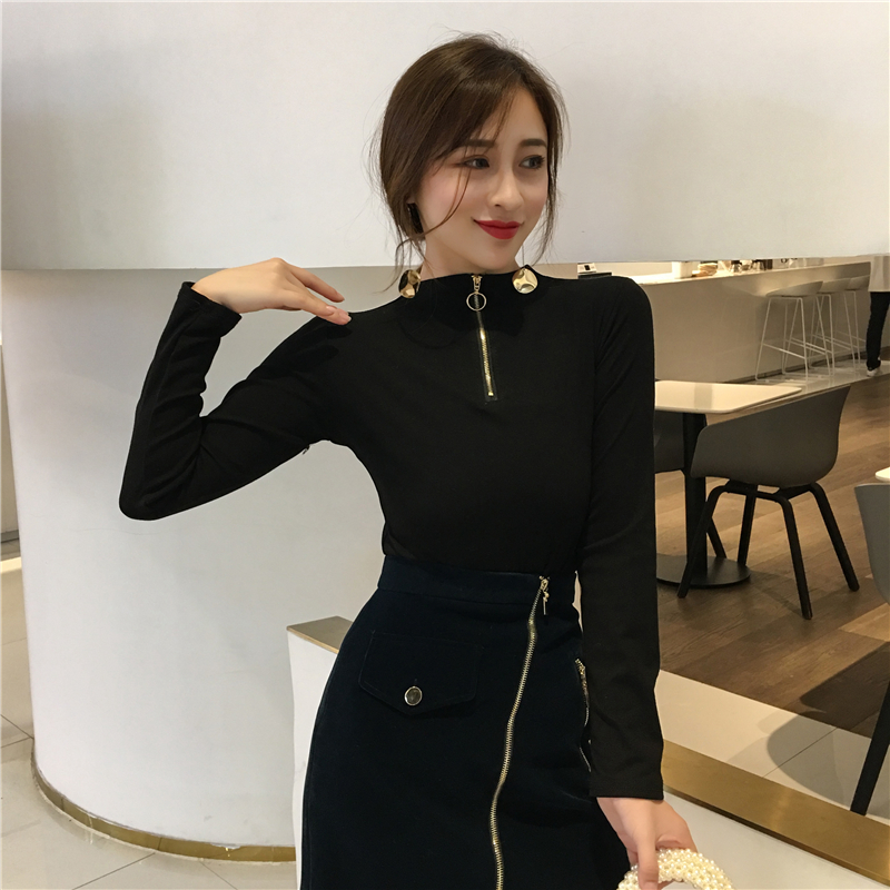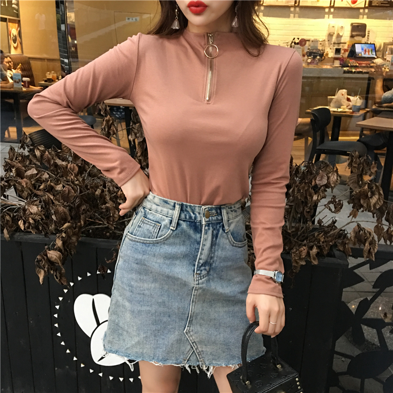 / 秋裝長袖t恤女2018新款韓版高領拉鏈心機上衣復古時尚百搭打底衫