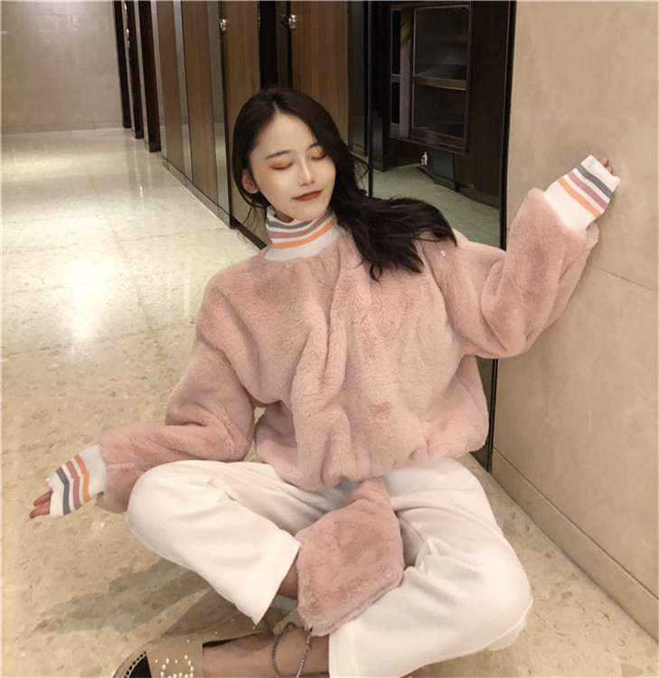 韓版慵懶風上衣女寬松百搭高領套頭長袖毛毛衛衣女配送毛毛包包女