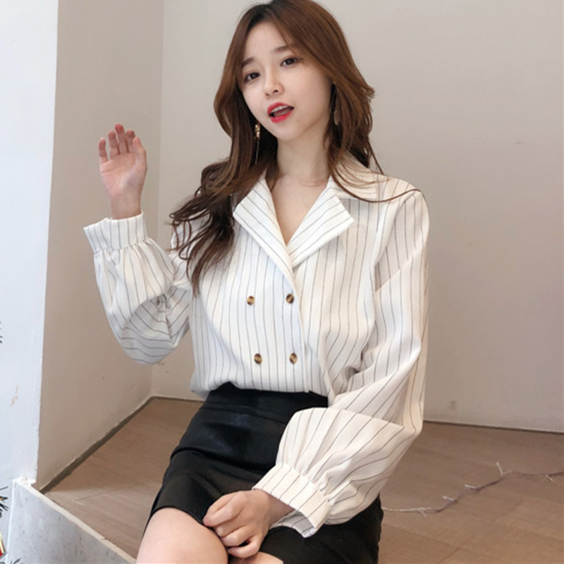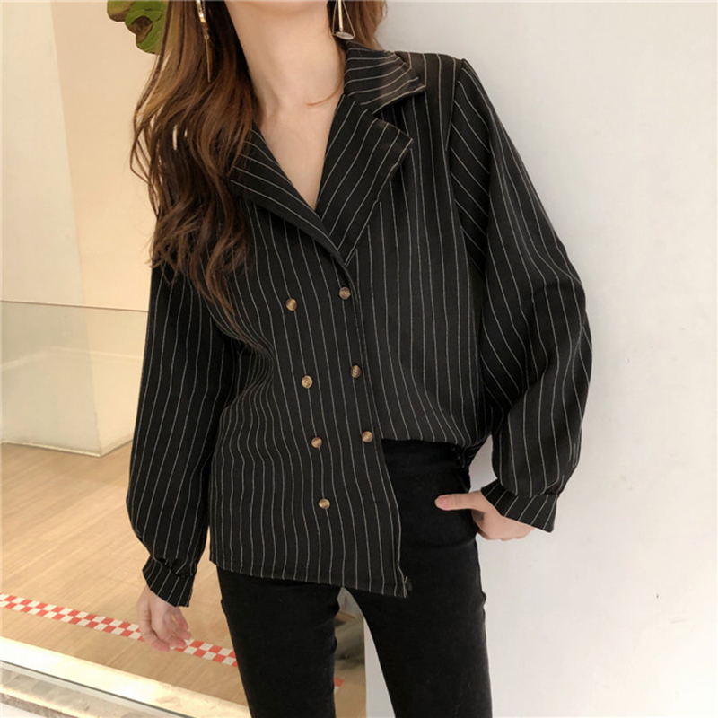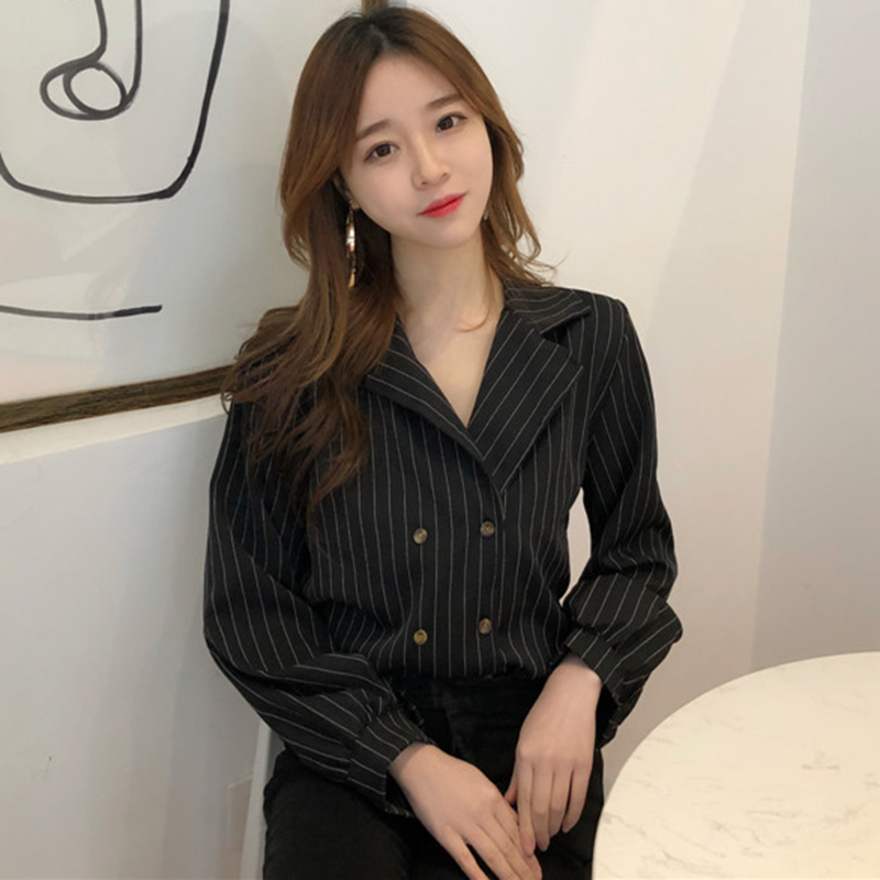 / 早春新款女裝復古條紋百搭雙排扣寬松顯瘦V領學生長袖襯衣外套女