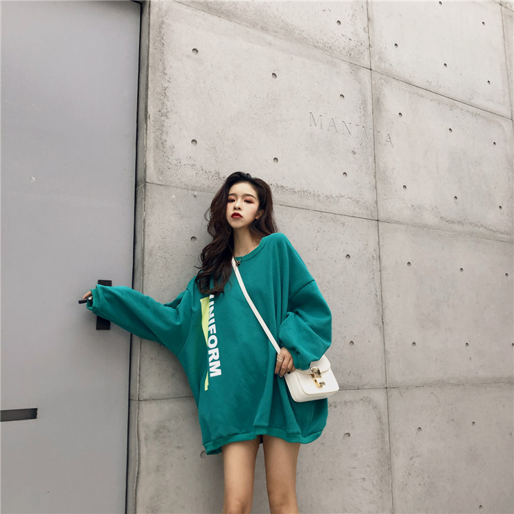 衛衣2018新款女長袖韓版寬松顯瘦oversize印花半高領慵懶長款裙子