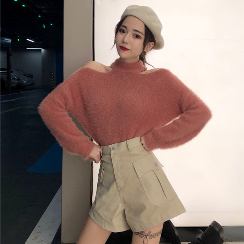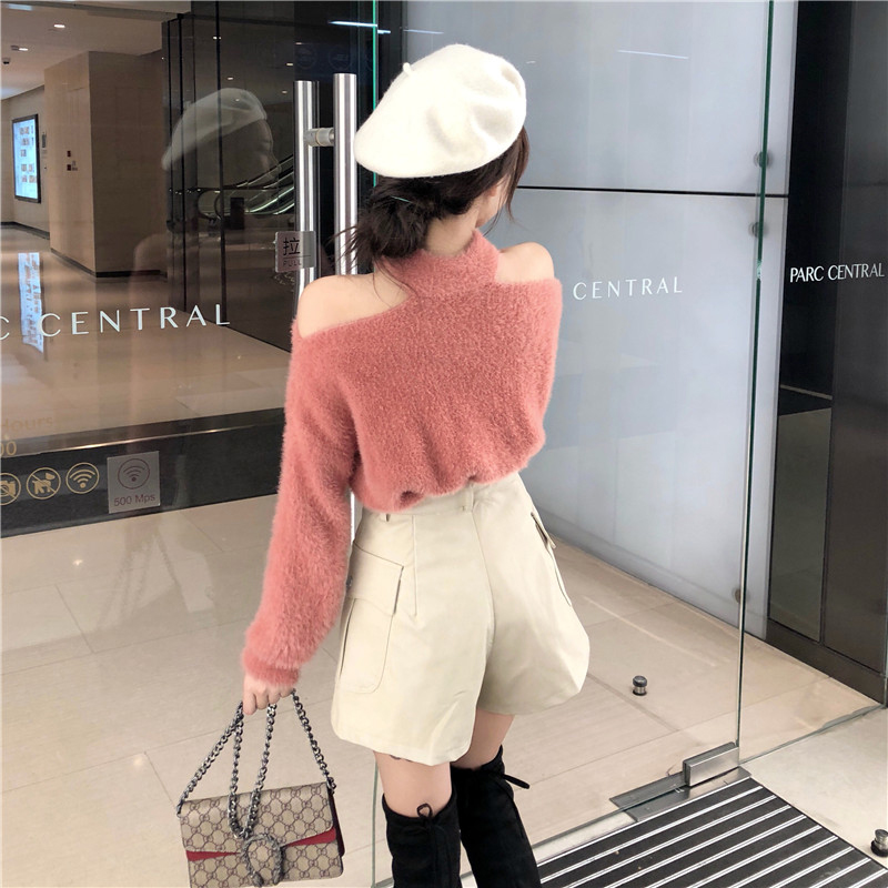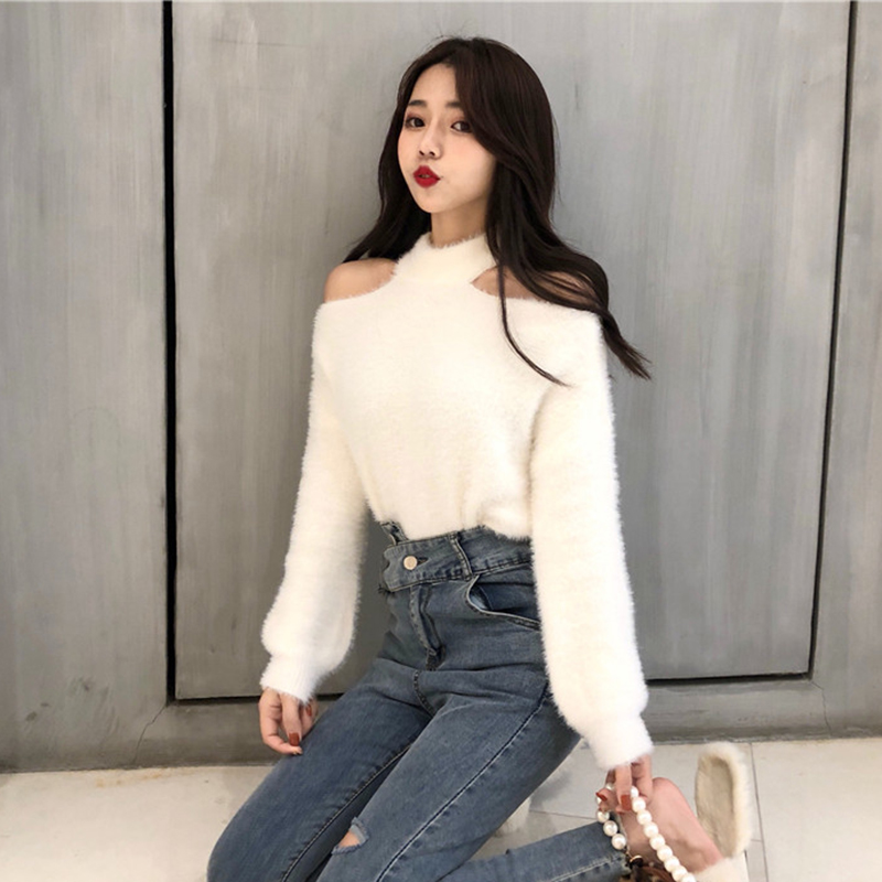 chic百搭寬松毛衣外套女秋冬裝2018新款小心機高領露肩長袖針織衫