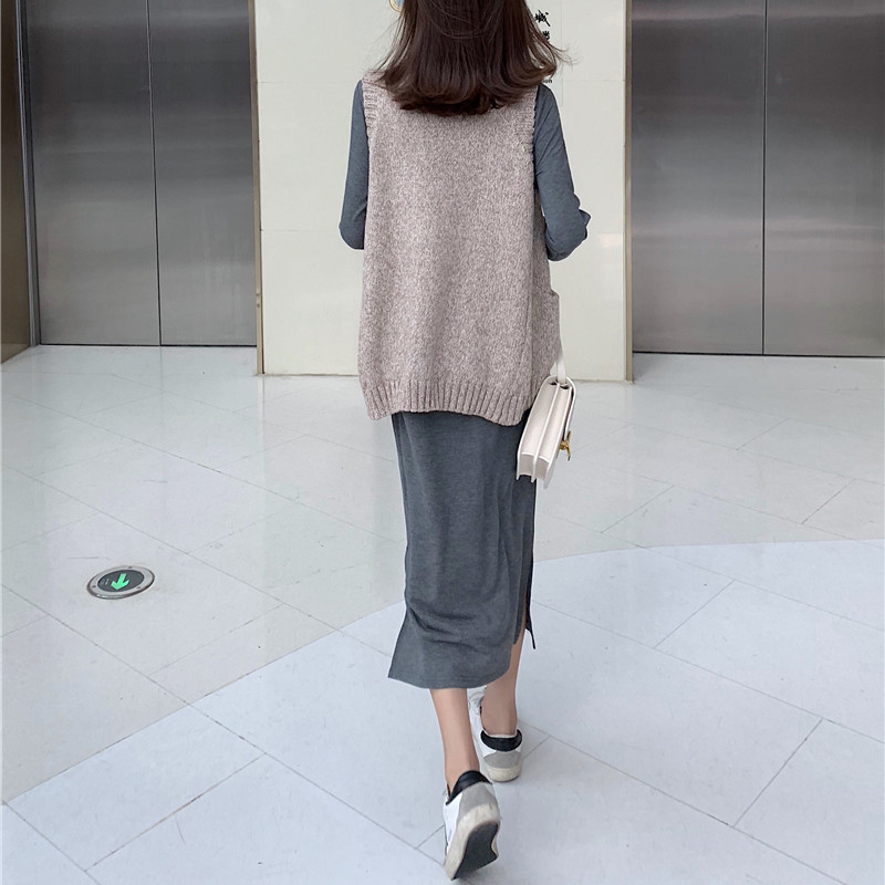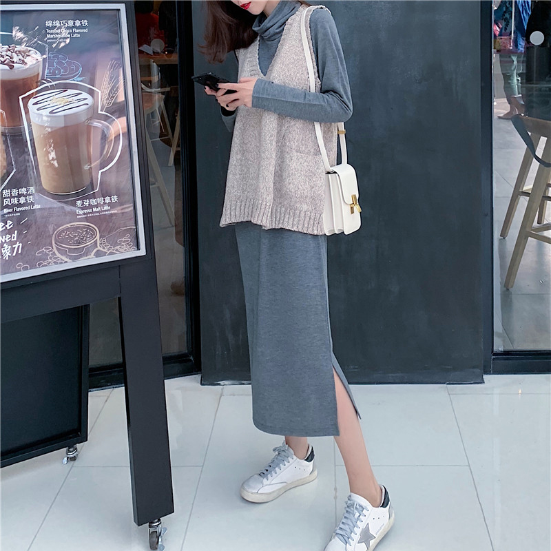 / 秋裝女新款chic復古外穿V領針織馬甲配氣質長袖開叉連衣裙兩件套