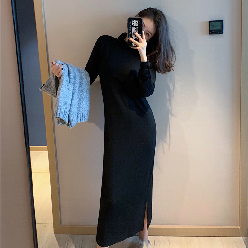 秋裝女新款chic復古外穿V領針織馬甲配氣質長袖開叉連衣裙兩件套