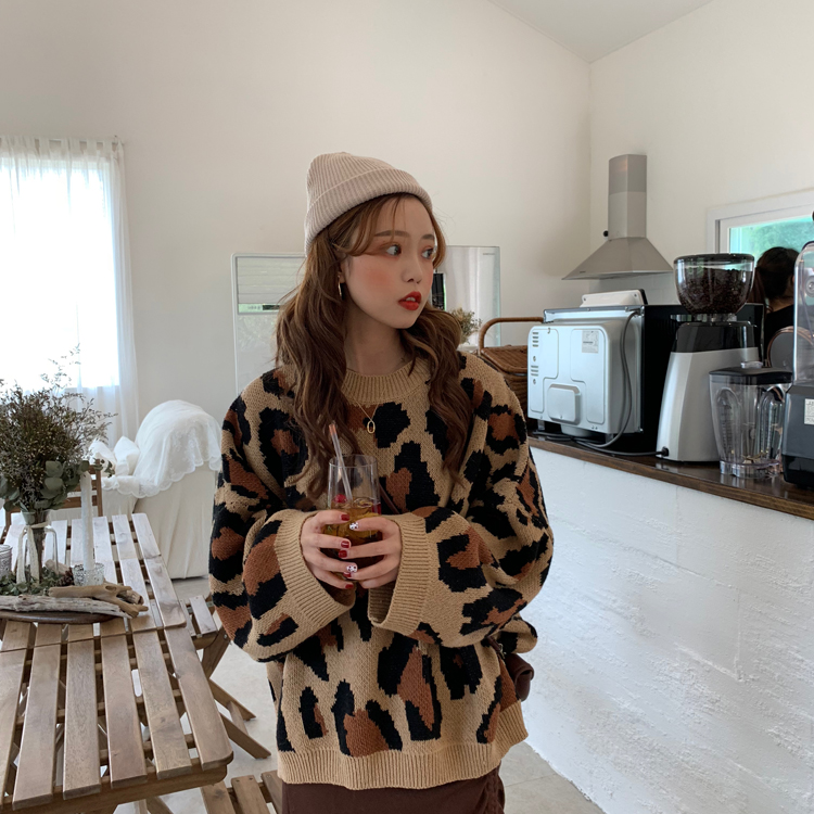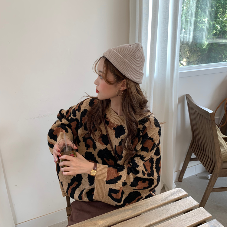 / 秋冬女裝韓版港味復古豹紋寬松慵懶風針織衫網紅套頭毛衣上衣外套