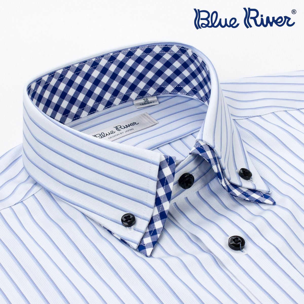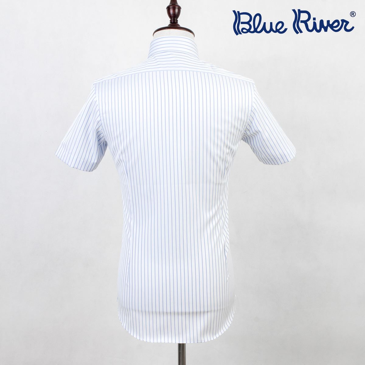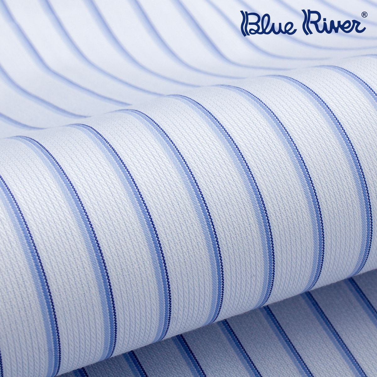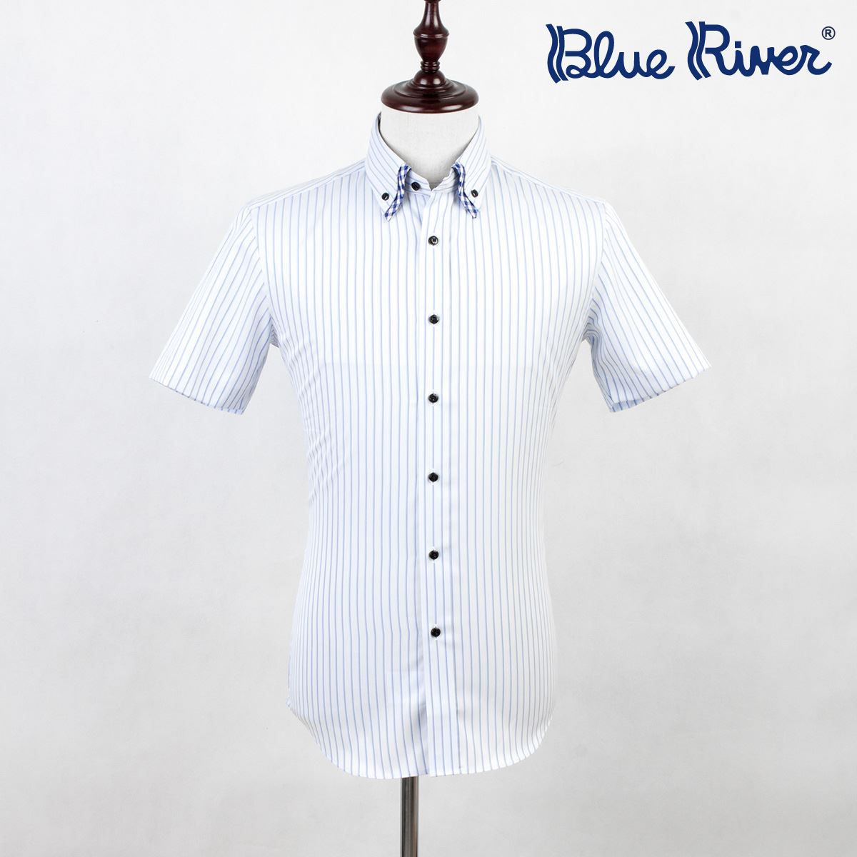 / 襯衫男短袖天藍色條紋雙層領純棉時尚免燙藍河2018夏季新男士襯衣