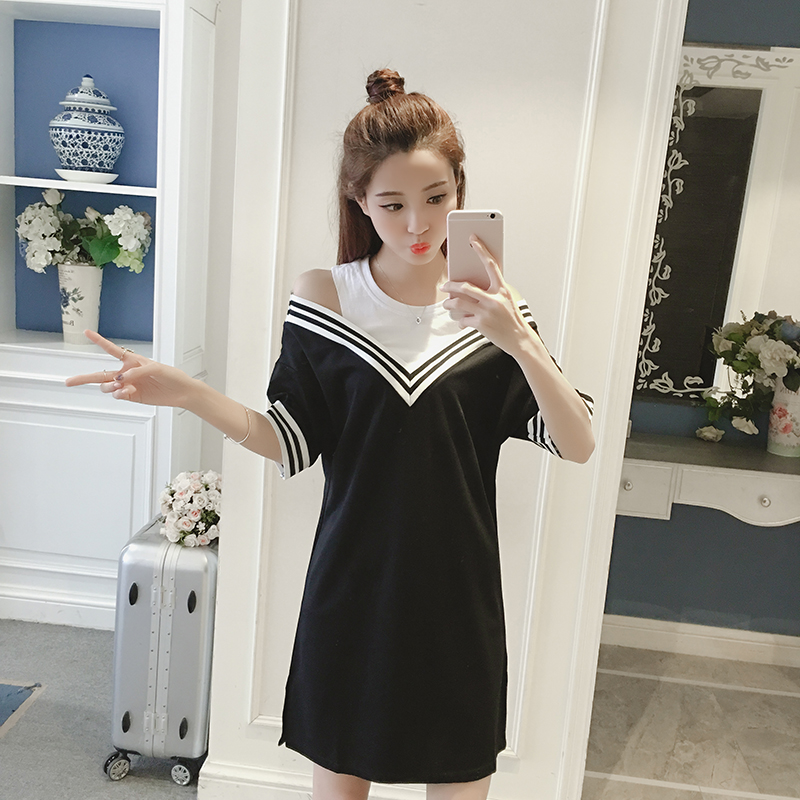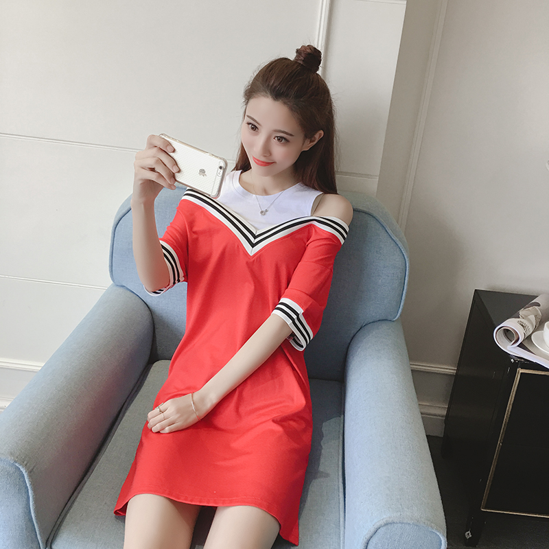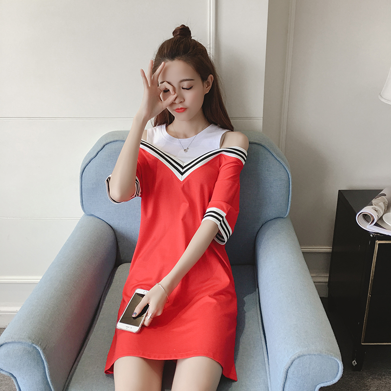 / 新款韓版V領拼接吊帶T恤裙中長款寬松顯瘦露肩短袖連衣裙女夏