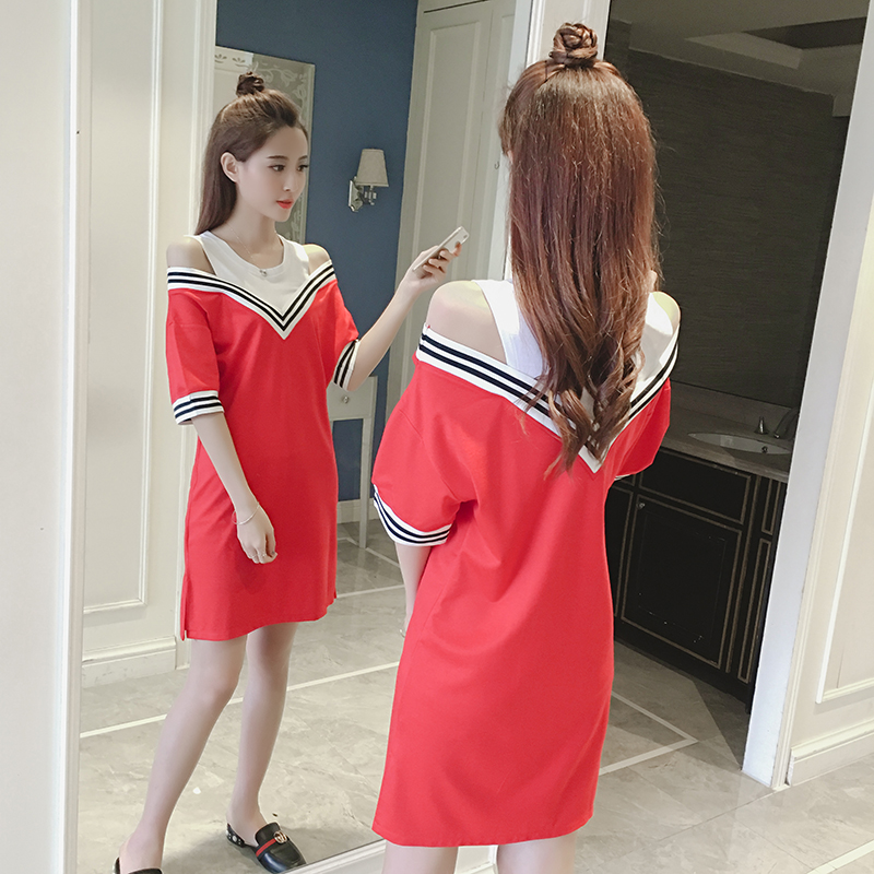 新款韓版V領拼接吊帶T恤裙中長款寬松顯瘦露肩短袖連衣裙女夏
