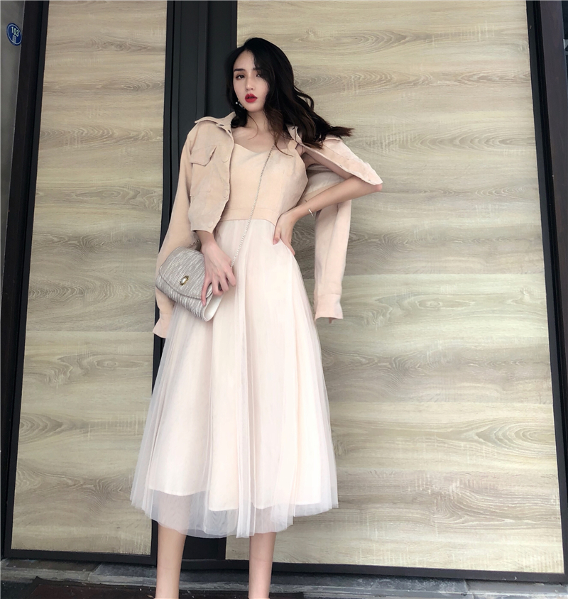 / 時尚套裝女新款韓版氣質吊帶燈芯絨拼接網紗連衣裙短款外套兩件套