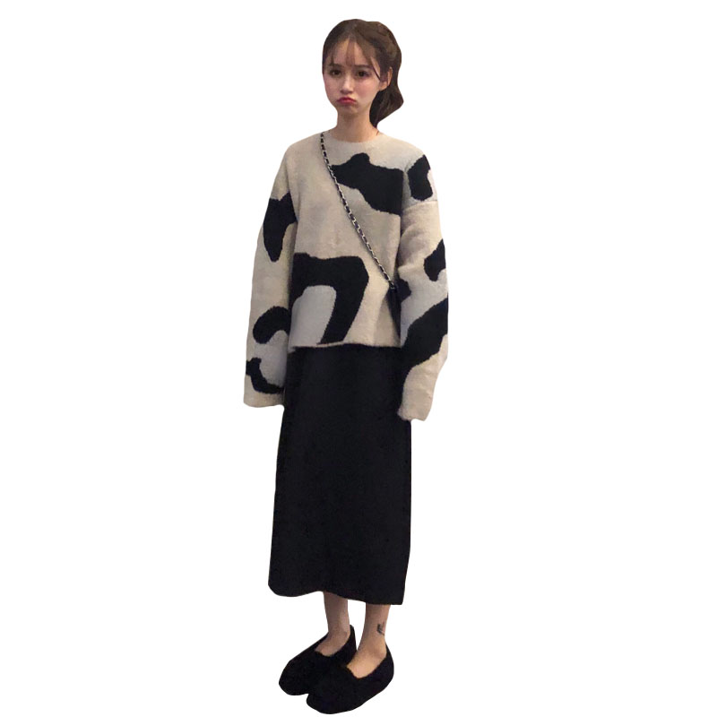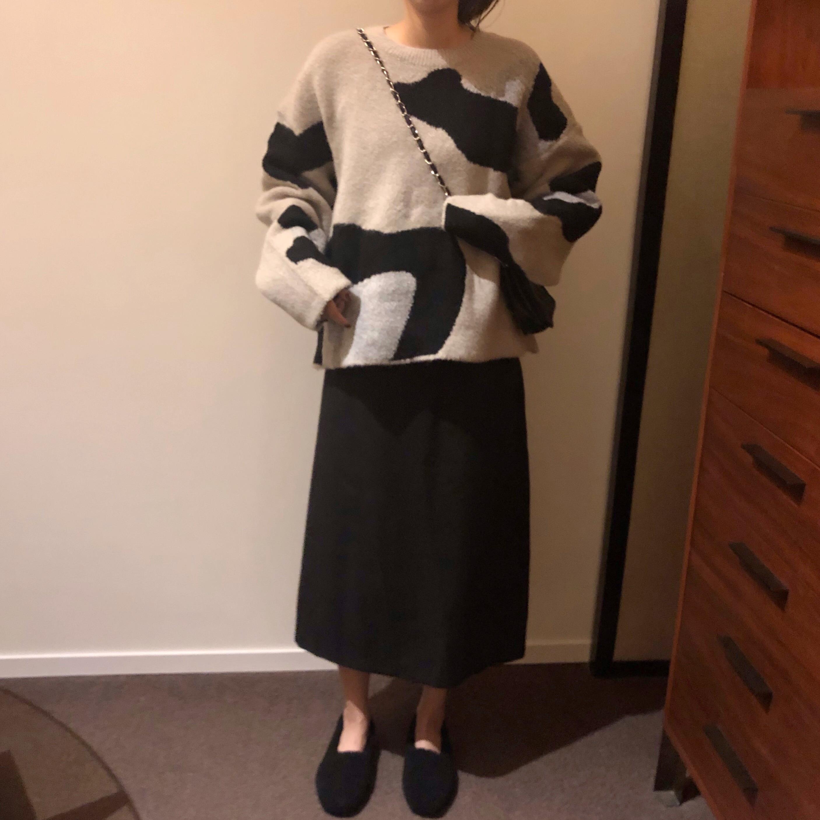 / 韓版時尚休閑套裝秋冬女裝厚實奶牛針織衫毛衣+開叉半身裙兩件套