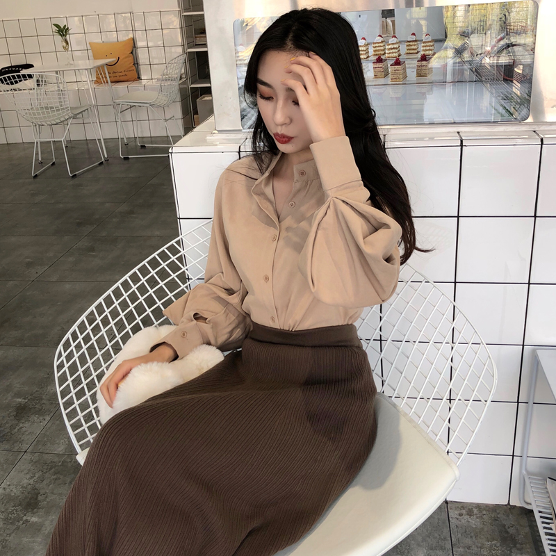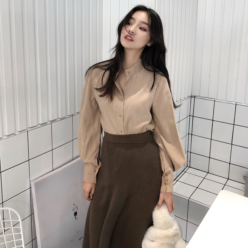 2018新款韓版港味復古立領單排扣寬松chic燈籠袖百搭襯衫女上衣潮