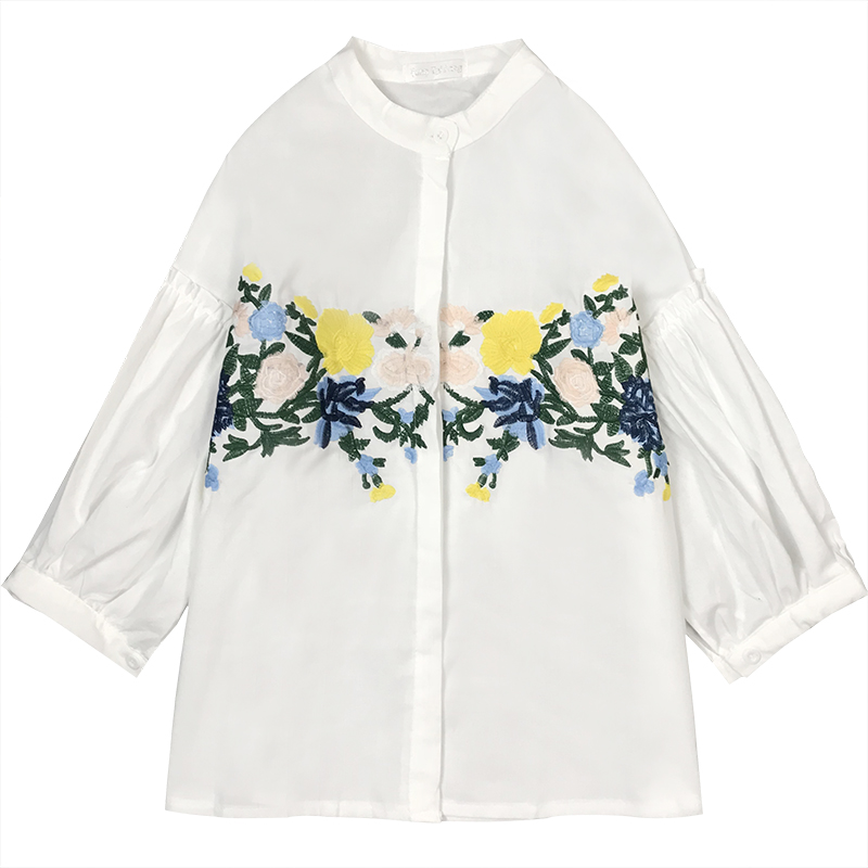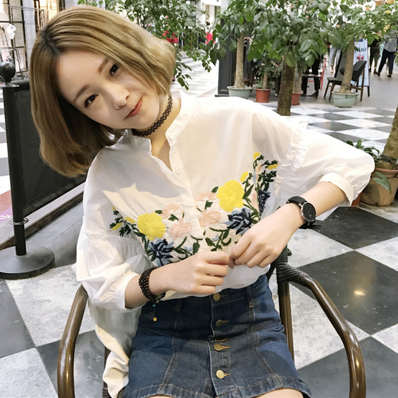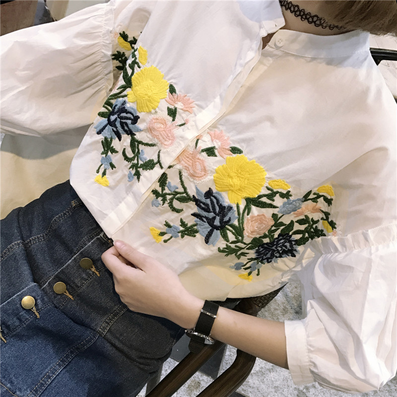 / 春季新款女裝寬松顯瘦小立領刺繡燈籠袖學生百搭長袖襯衫上衣女