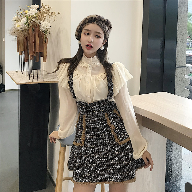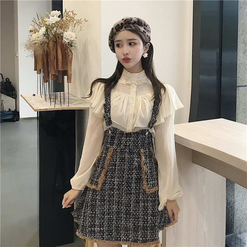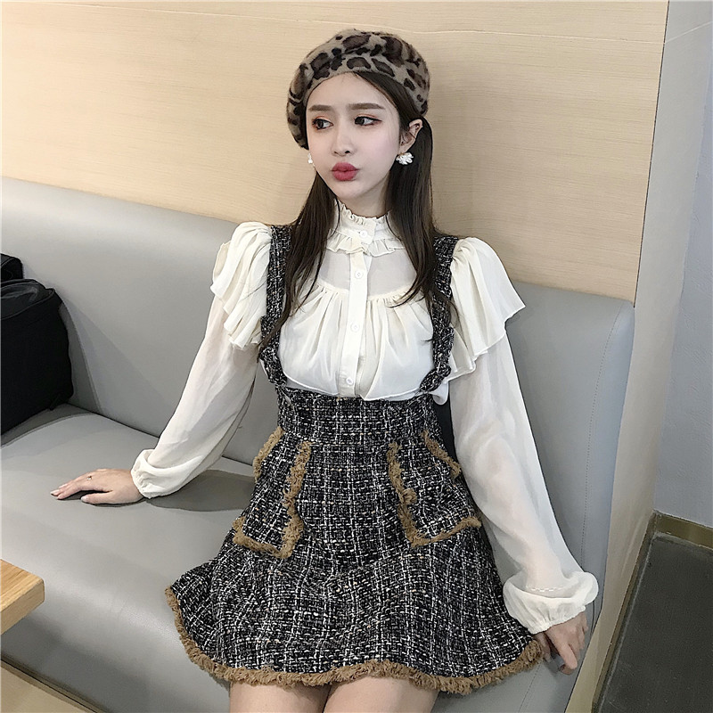 韓風chic甜美木耳邊燈籠袖娃娃衫上衣高腰流蘇背帶裙港風時尚套裝