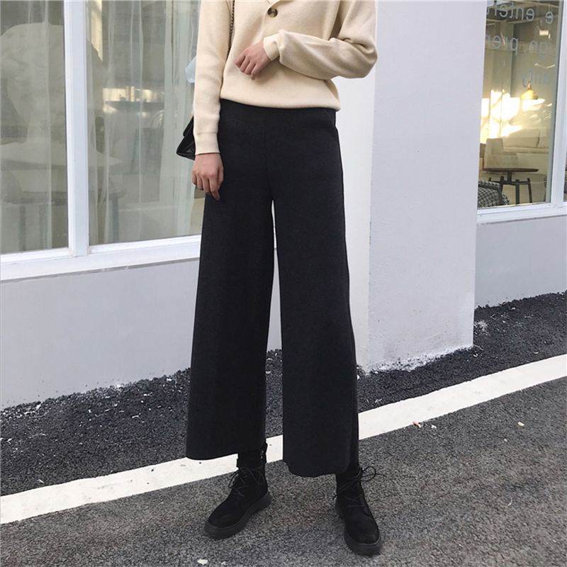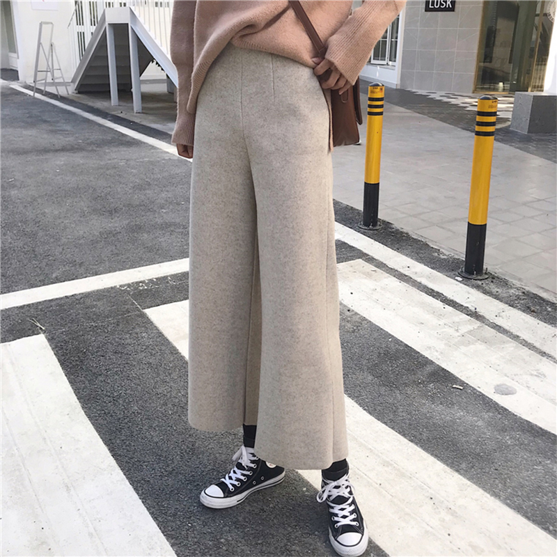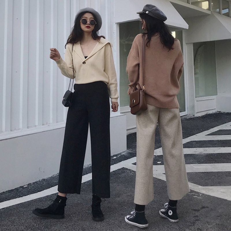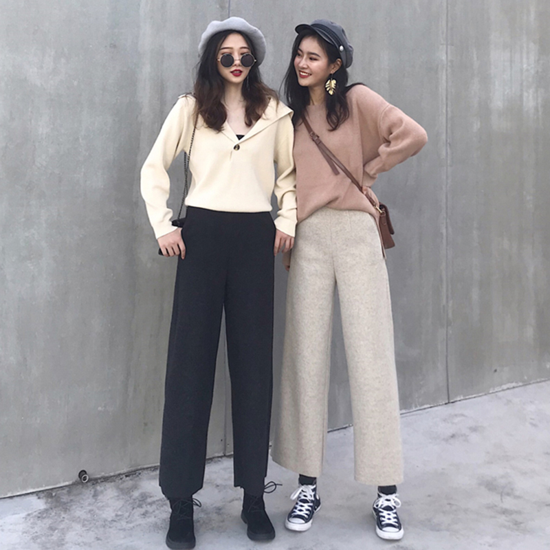 / 精神女生社會褲子冬裝2018新款毛呢休閑直筒褲高腰顯瘦九分闊腿褲