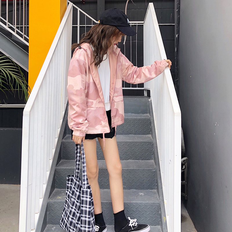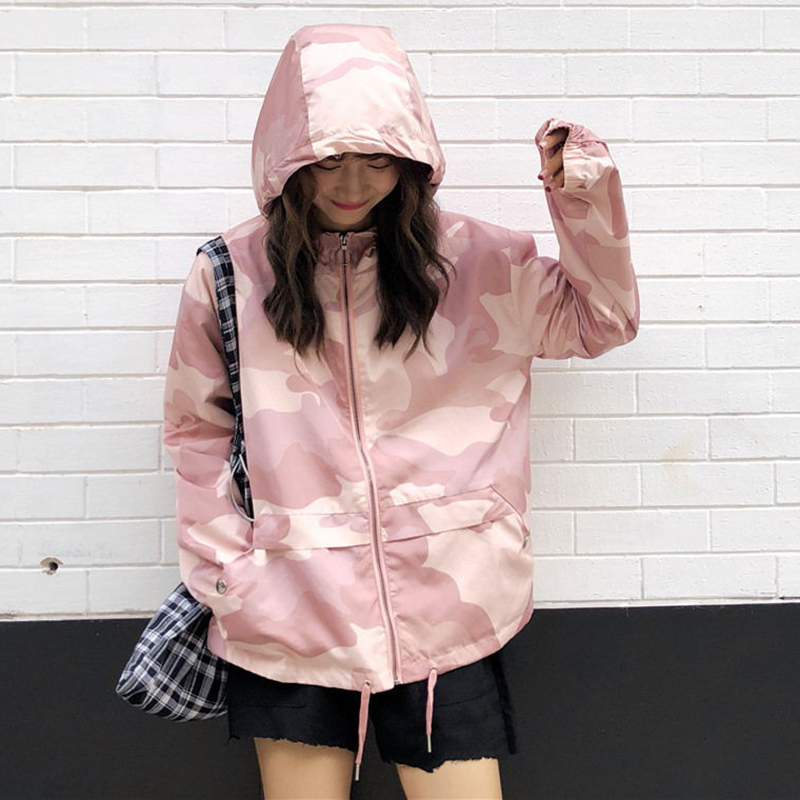 / 迷彩粉色外套女秋裝新款韓版寬松長袖連帽風衣學生休閑夾克上衣潮
