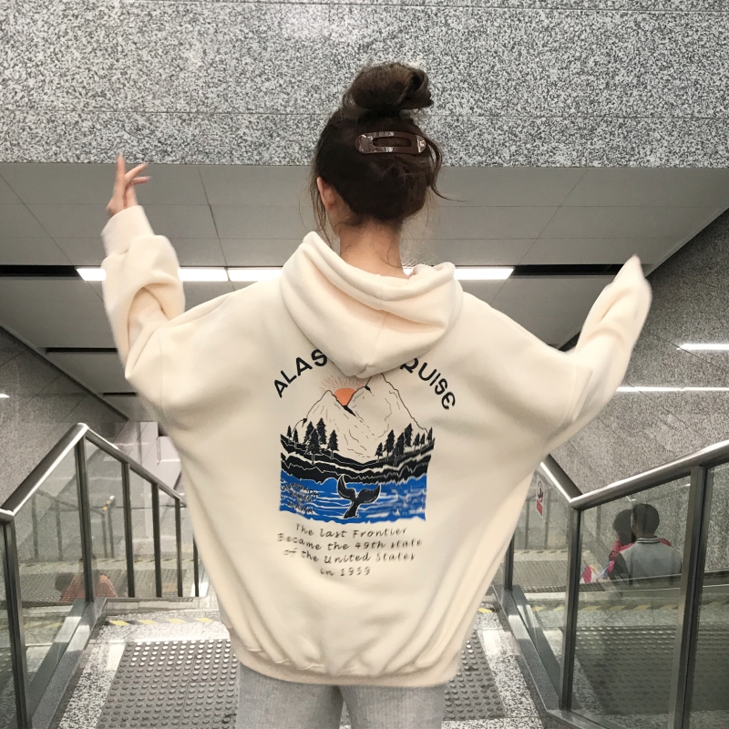 秋冬女裝韓版慵懶風寬松原宿風卡通字母加絨加厚連帽衛衣上衣外套