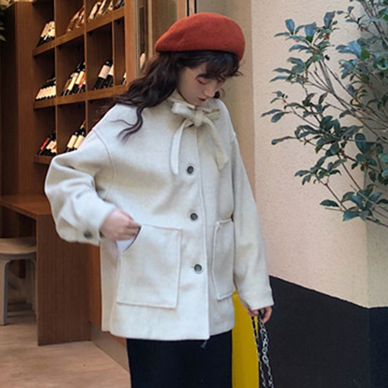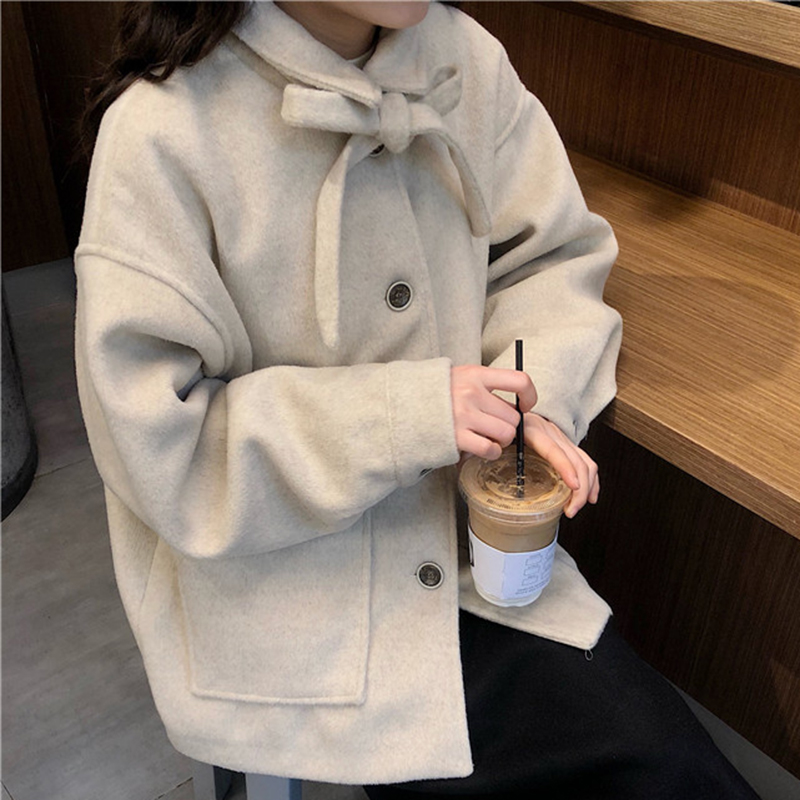 / 2018流行毛呢外套女秋冬裝新款赫本大衣純色蝴蝶結開衫學院風上衣