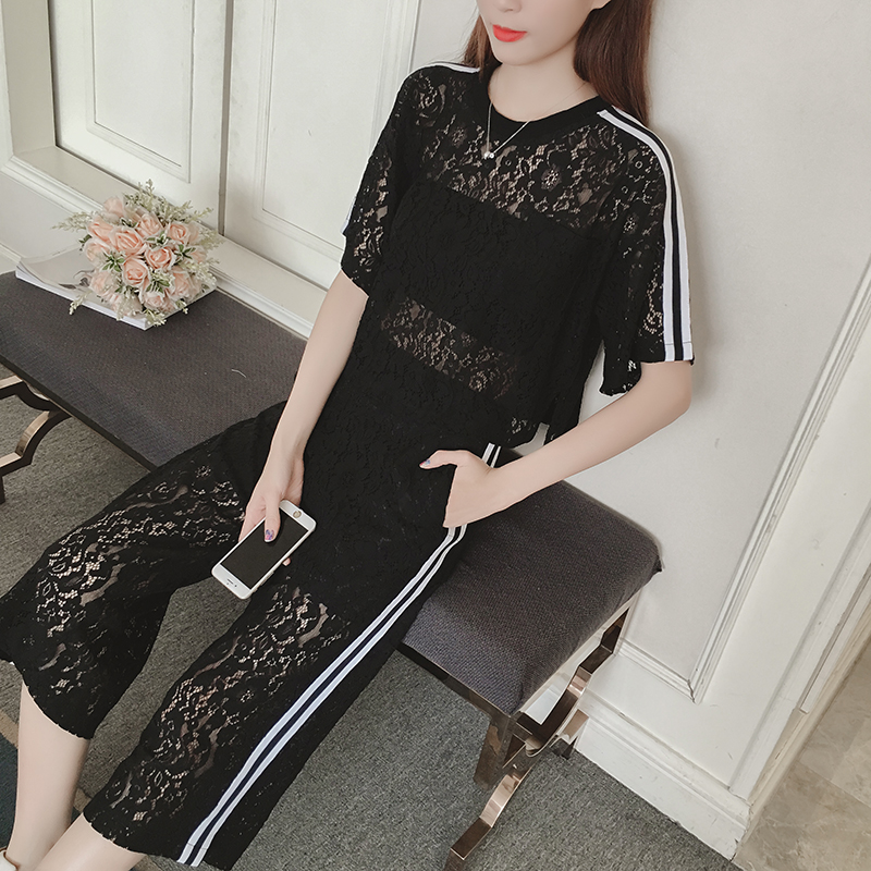 夏季新款女裝名媛氣質蕾絲衫上衣兩件套休閑七分闊腿褲套裝韓版潮