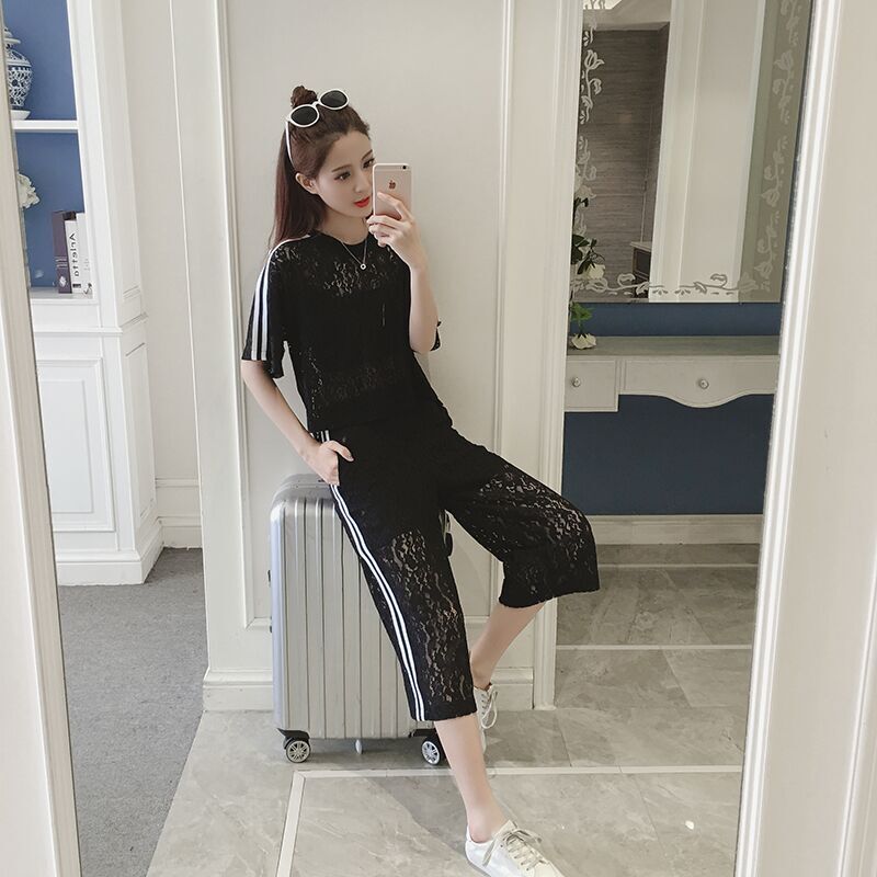 / 夏季新款女裝名媛氣質蕾絲衫上衣兩件套休閑七分闊腿褲套裝韓版潮