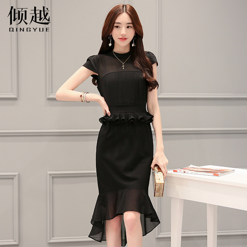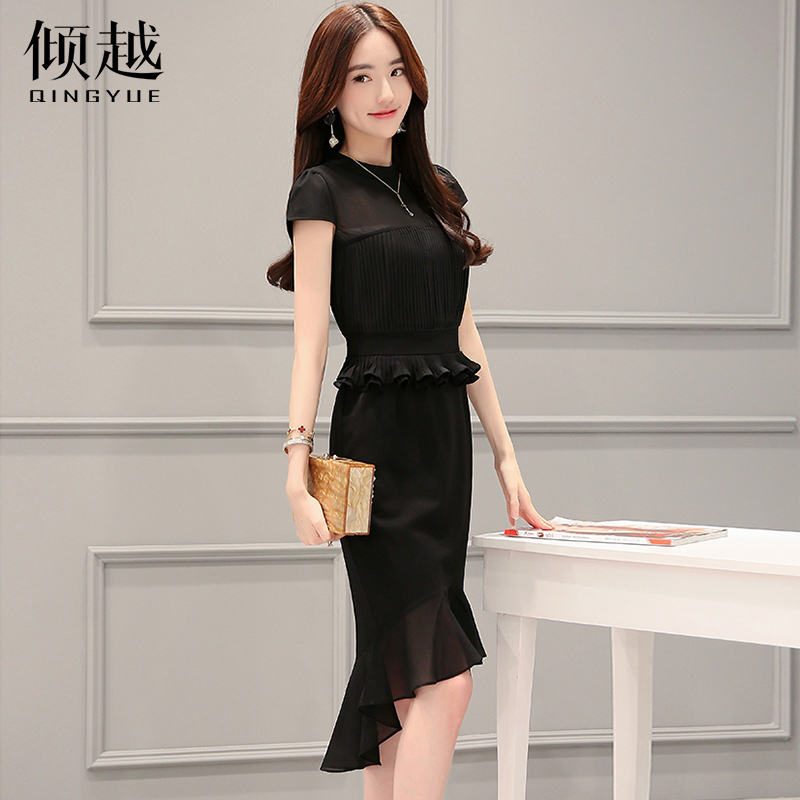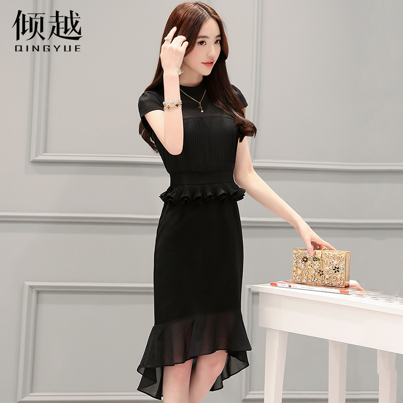 / 2017夏裝新款時尚優雅圓領荷葉邊收腰顯瘦短袖連衣裙純色魚尾裙女