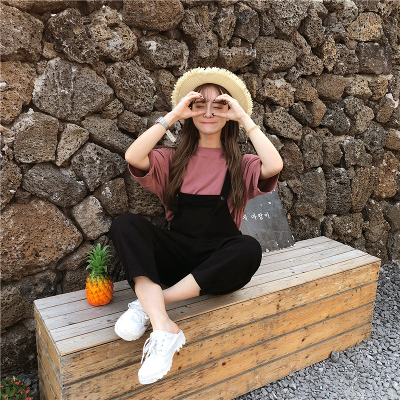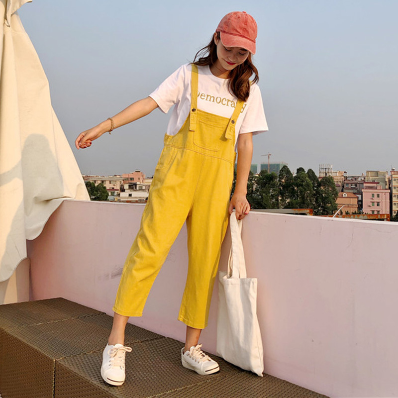 夏季新款女裝學院風百搭寬松顯瘦工裝學生休閑直筒九分背帶褲女