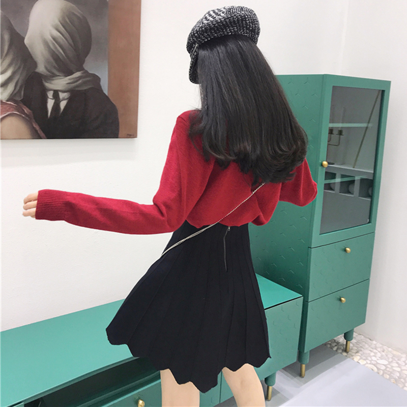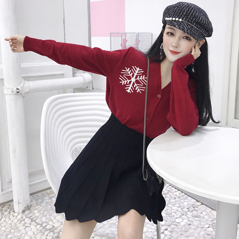 / 赫本風針織套裝女秋冬新款雪花V領開衫外套高腰顯瘦百褶半身裙子