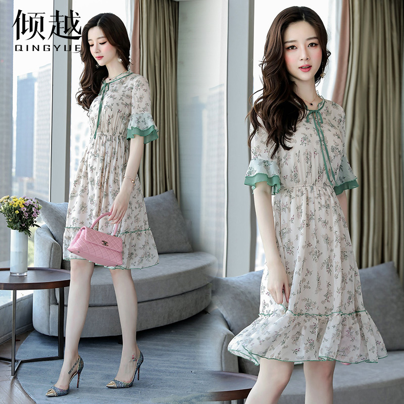 2017夏季新款女裝小清新五分袖中長款系帶拼接碎花印花雪紡連衣裙