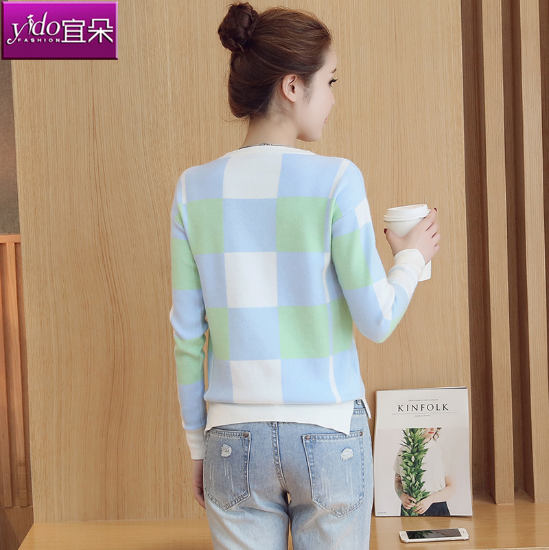 / 短款針織衫毛衣女春裝套頭長袖格子針織衫女春季撞色針織打底衫女