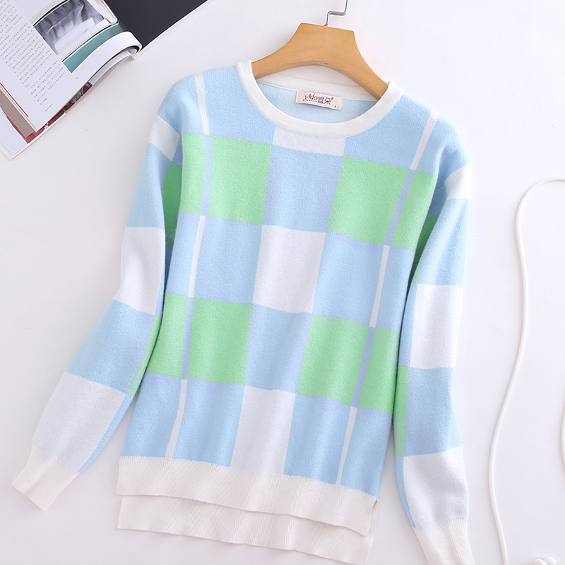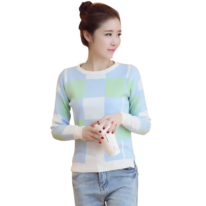 短款針織衫毛衣女春裝套頭長袖格子針織衫女春季撞色針織打底衫女