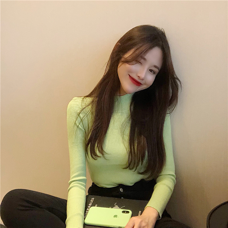 糖果色新款半高圓領顯瘦上衣韓版學院風長袖修身復古chic針織衫女