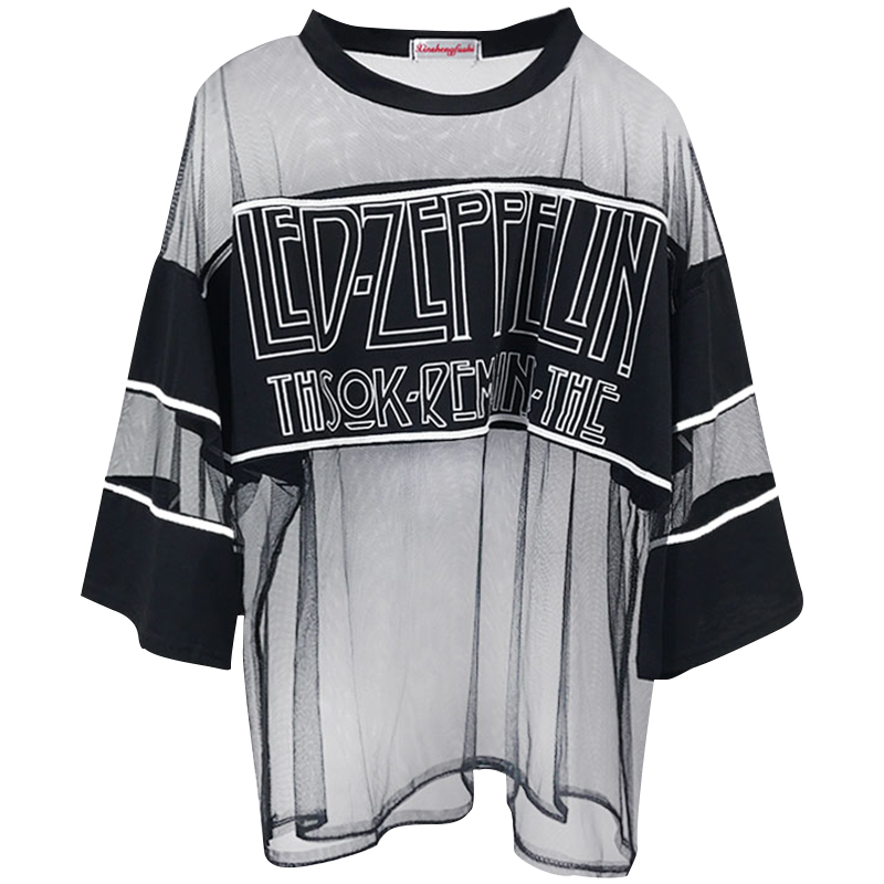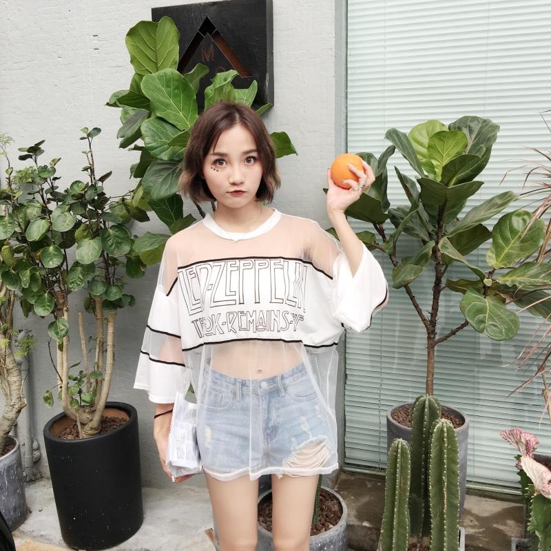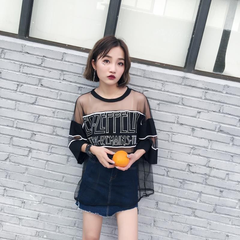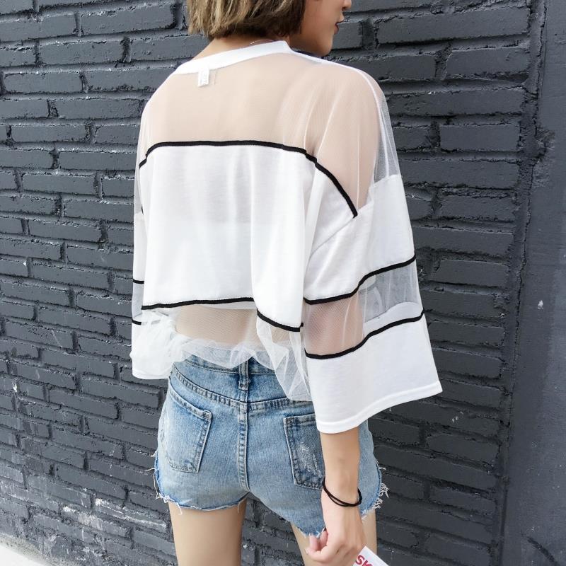 / 早春新款女裝原宿風透視寬松顯瘦中長款學生七分袖防曬衣罩衫T恤