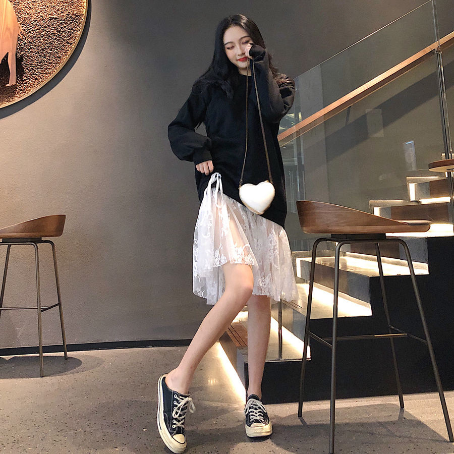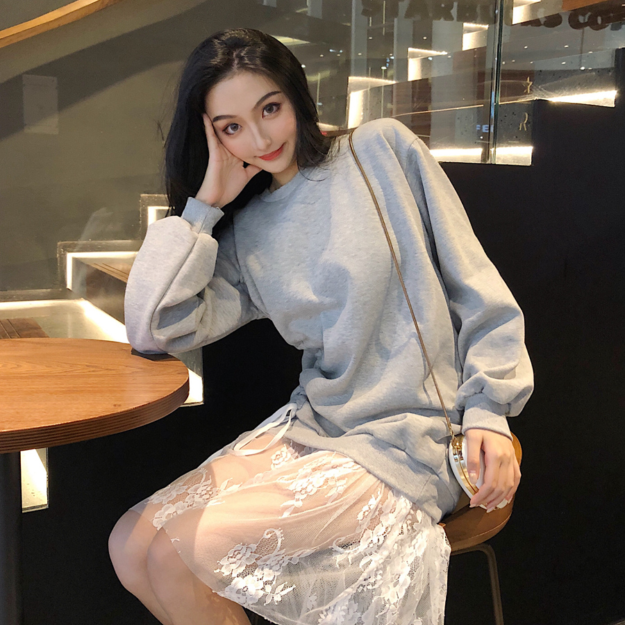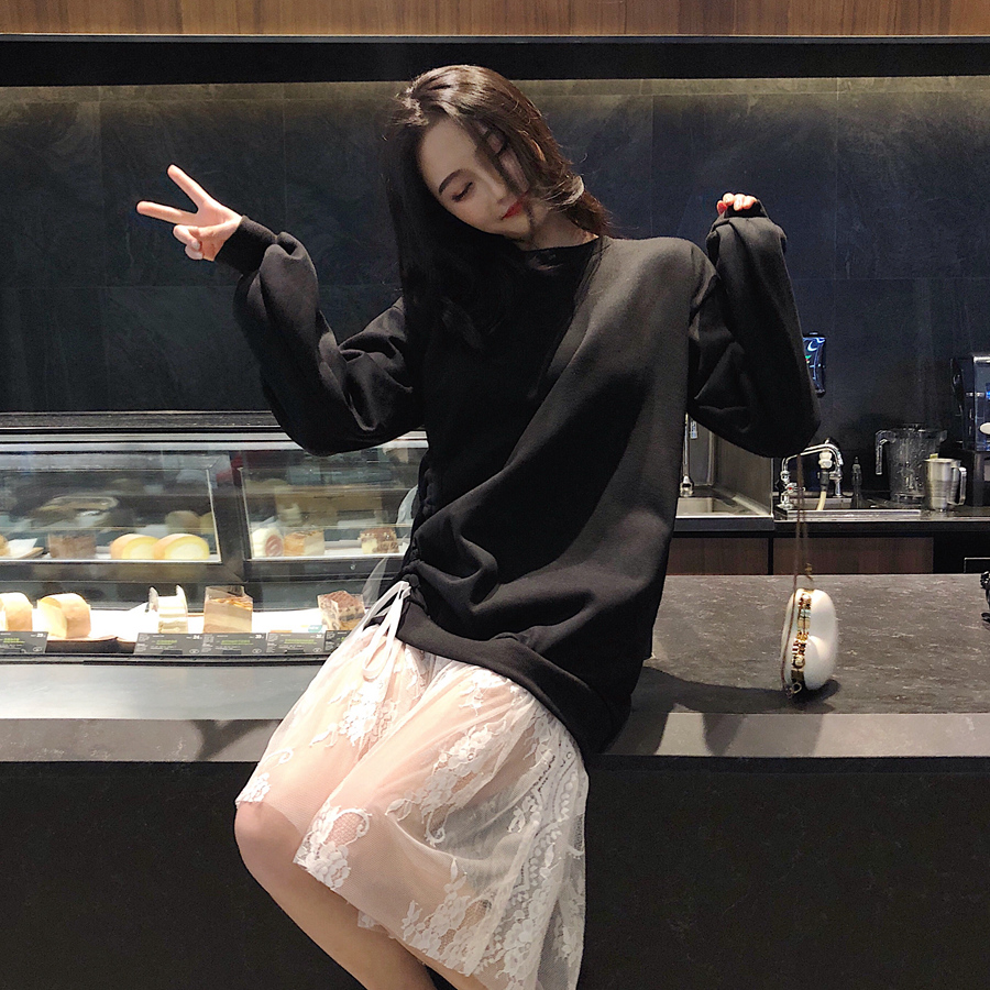/ 港味加絨套頭抽繩衛衣女秋冬2018新款韓版中長款時尚拼接蕾絲裙擺