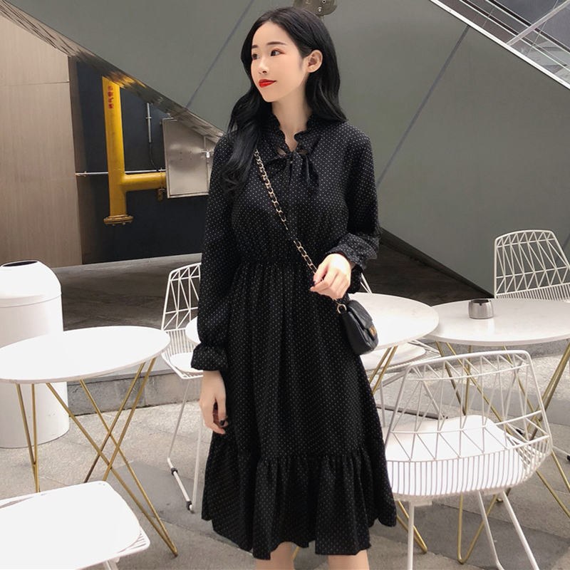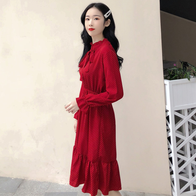 / 復古蝴蝶結波點中長雪紡連衣裙子秋冬裝新款法式少女荷葉邊桔梗裙