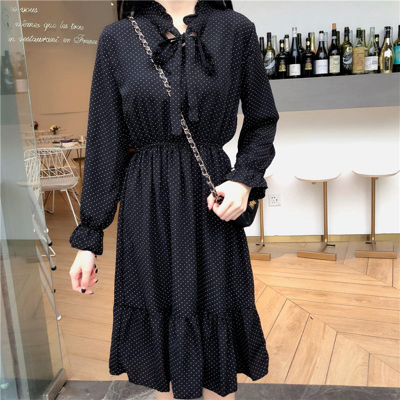 復古蝴蝶結波點中長雪紡連衣裙子秋冬裝新款法式少女荷葉邊桔梗裙