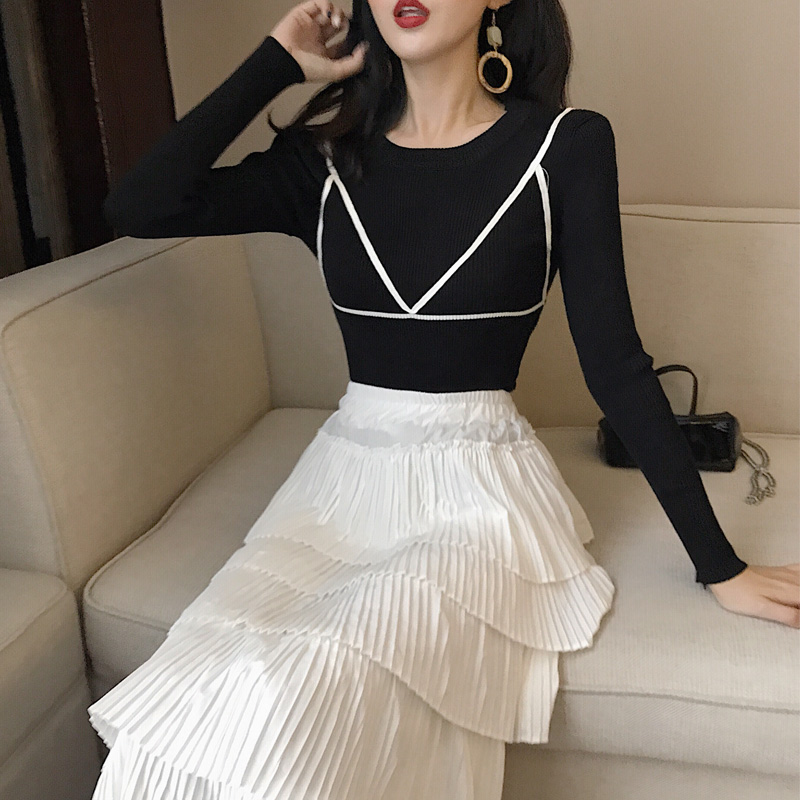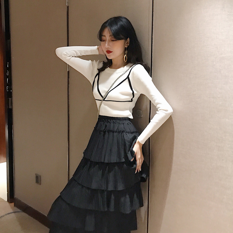 秋裝女2018新款套裝修身顯瘦針織衫長袖+中長款百褶蛋糕裙兩件套