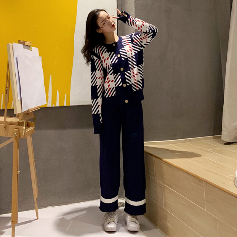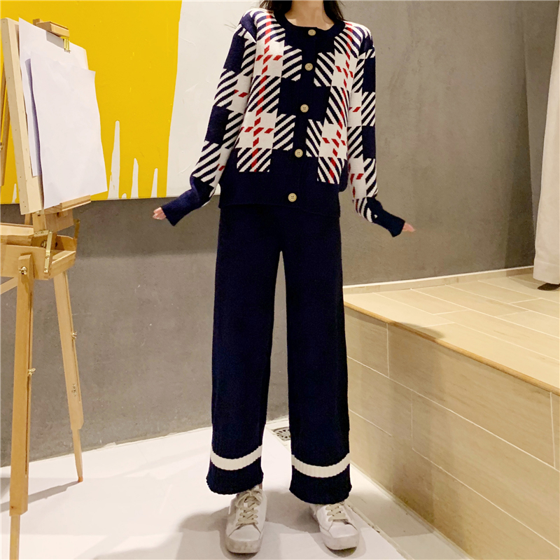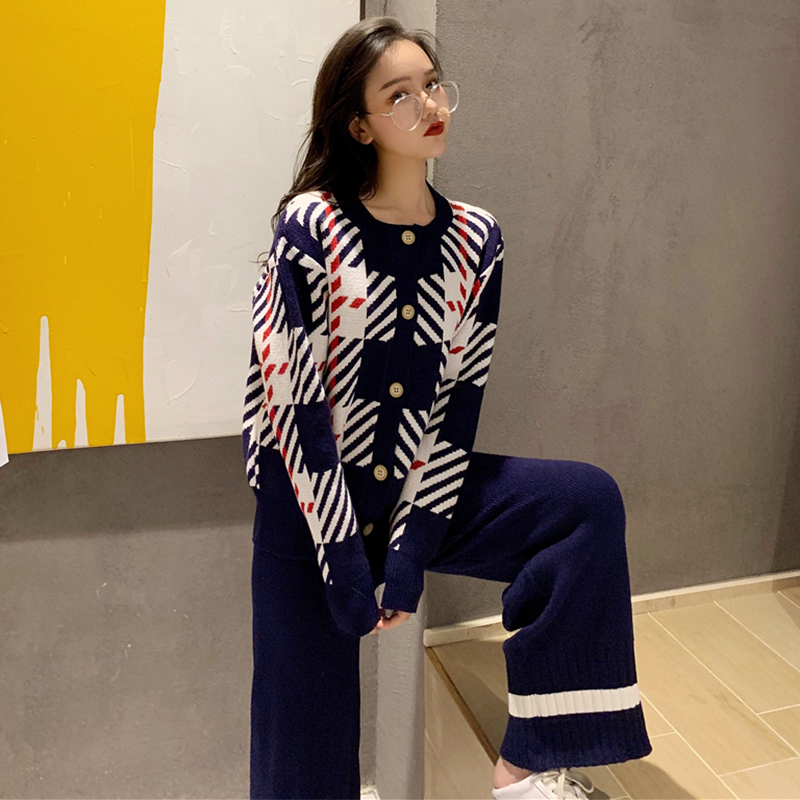 / 時尚套裝女秋冬新款復古撞色格紋毛衣外套高腰寬松顯瘦針織闊腿褲