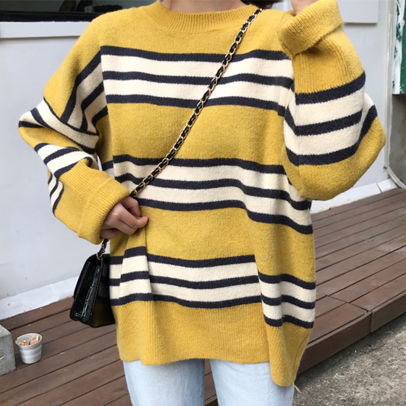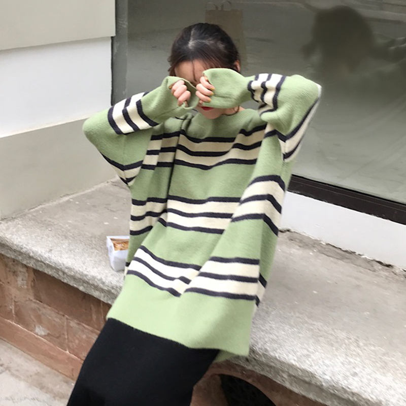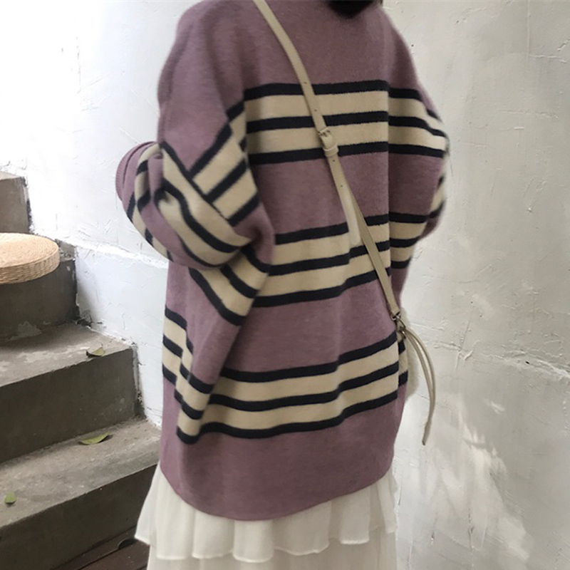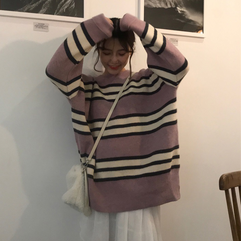 毛衣外套女秋冬裝2018新款寬松顯瘦圓領拼色長袖慵懶套頭針織上衣