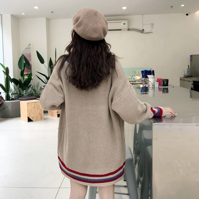 / 秋季新款女裝寬松中長慵懶風開衫女韓版長袖拼色針織毛衣時尚外套