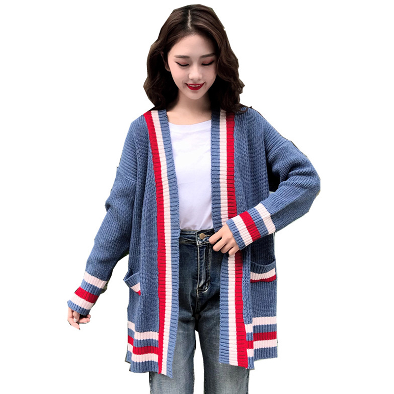 秋季新款女裝寬松中長慵懶風開衫女韓版長袖拼色針織毛衣時尚外套