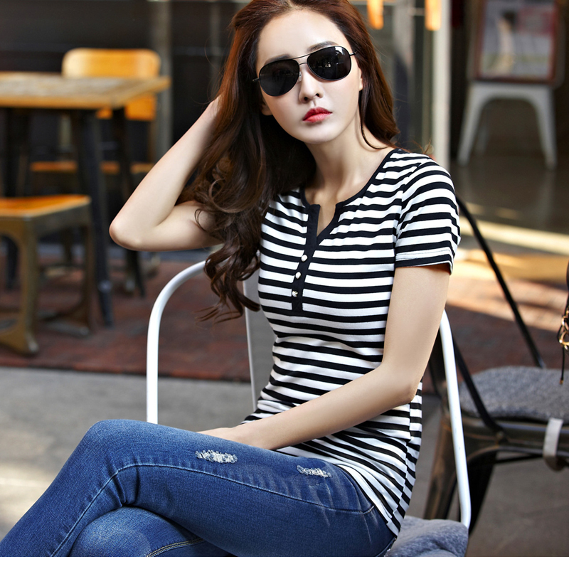女裝夏季新款純棉短袖t恤女上衣修身打底衫V領條紋半袖衣服體恤女