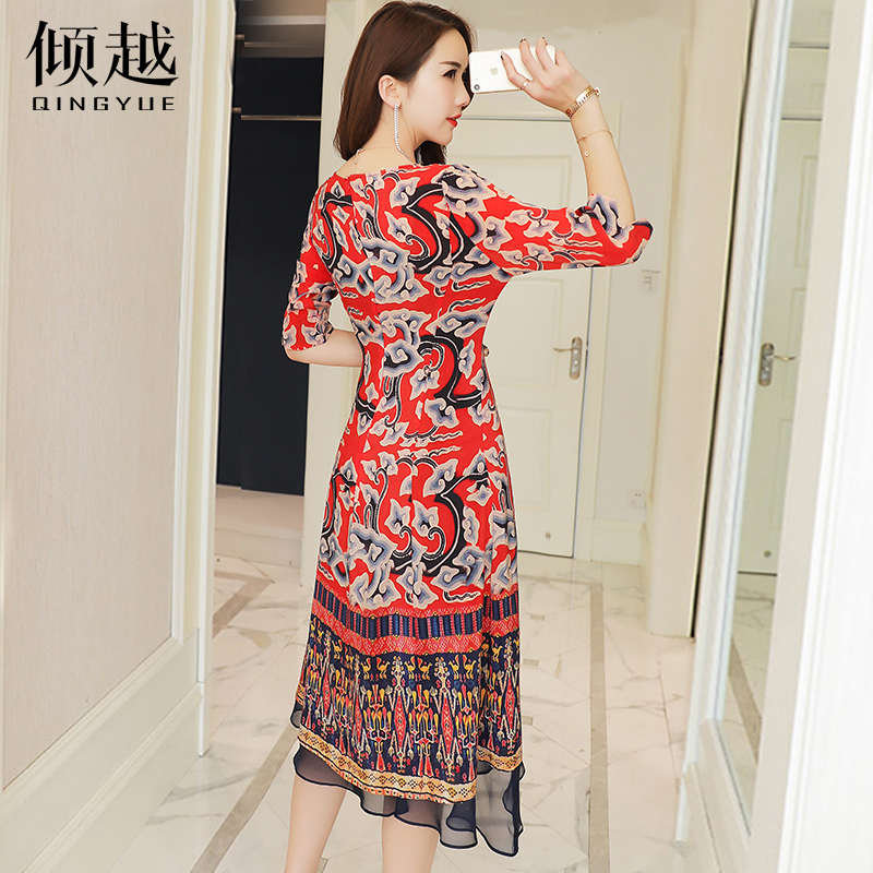 傾越2017夏季新款女裝連衣裙中長款修身民族風印花旗袍裙子套裝裙