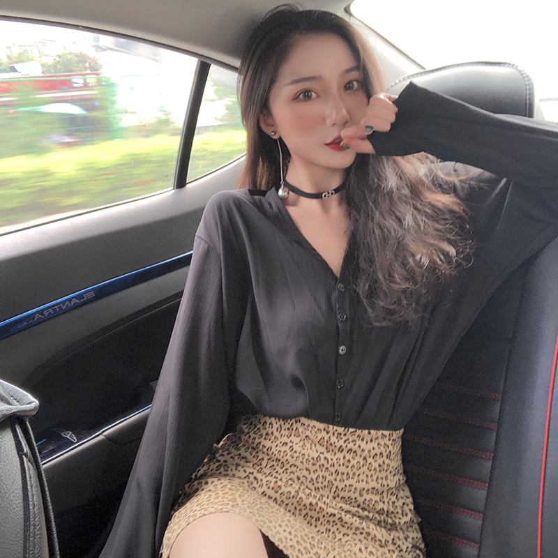 時尚套裝夏2018新款女裝寬松復古V領雪紡上衣+豹紋半身短裙倆件套