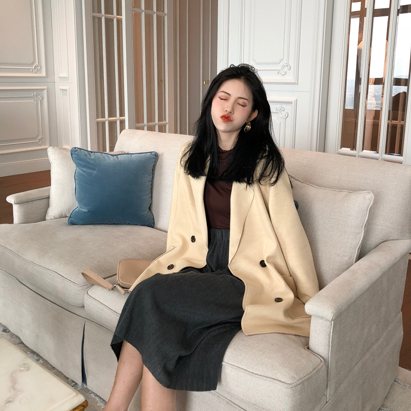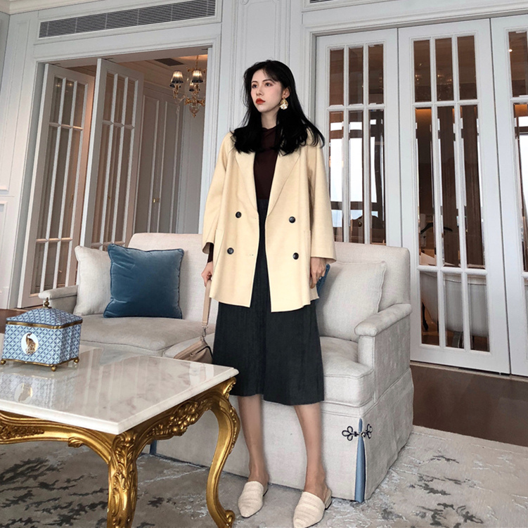 駝色外套|杏色外套|黑色半身裙|灰色半身裙|咖色打底衫|黑色打底衫