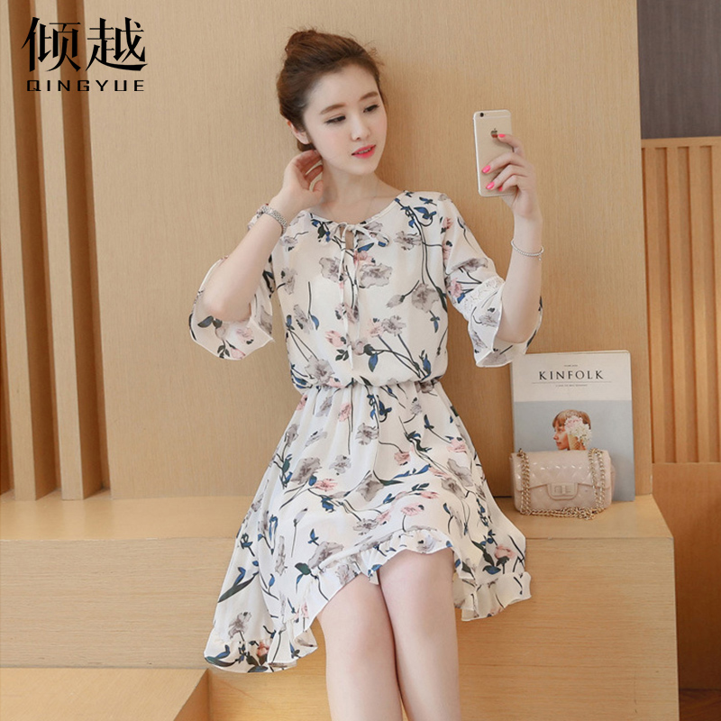 / 傾越2017春夏新款韓版女裝雪紡連衣裙顯瘦中長款魚尾裙子碎花長裙
