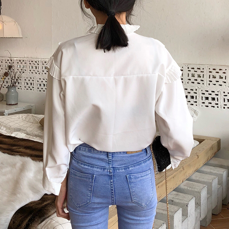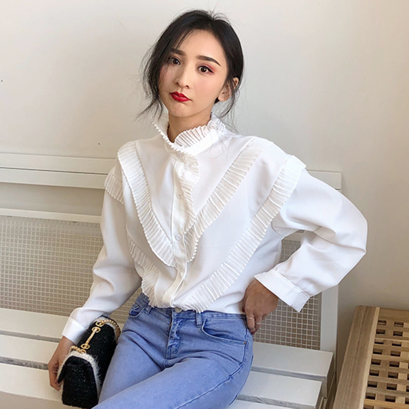 / 壓褶立領長袖襯衫女秋冬裝新款寬松顯瘦白色襯衣學生復古休閑上衣