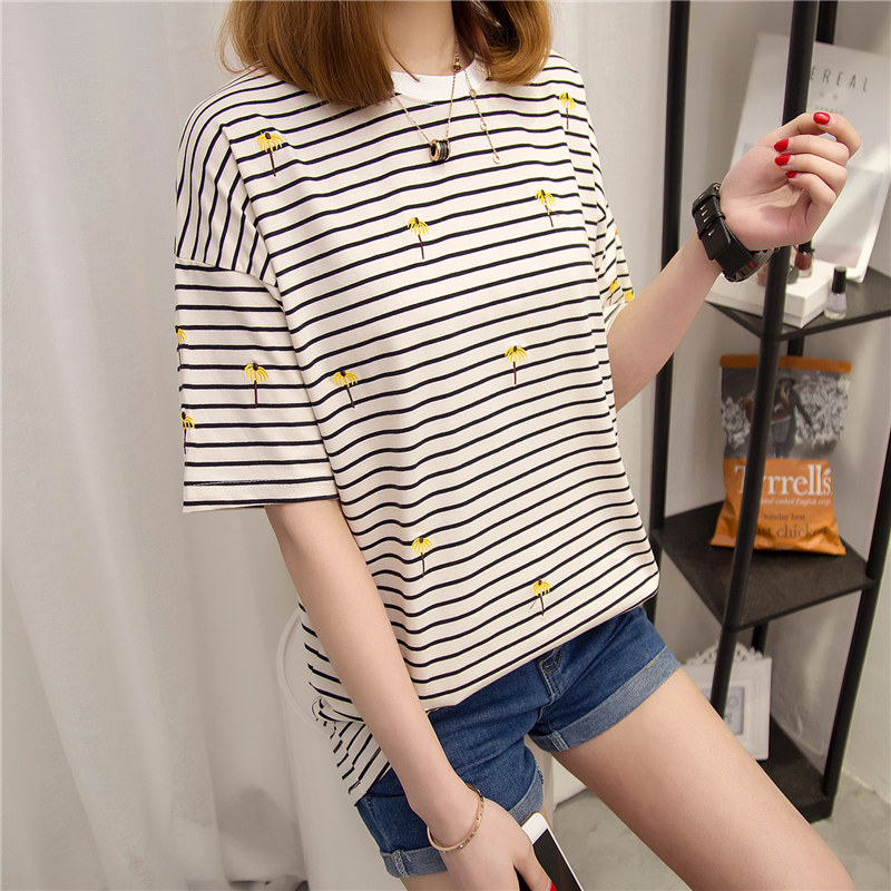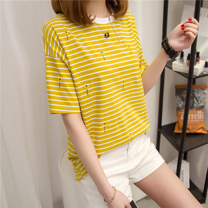 / 女裝春裝新款潮條紋短袖t恤女寬松上衣韓版體恤夏裝學生百搭